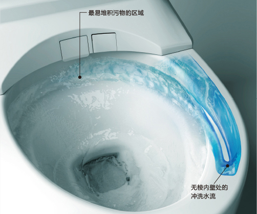 inside surface of the toilet bowl, while two captions are displayed: