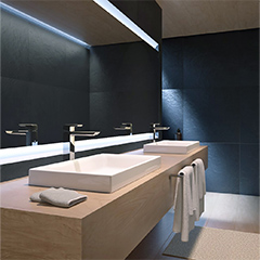 空间融合了许多自然元素,比如柏树天花板瓷砖、柏树梳妆台和黑色石灰石墙砖。