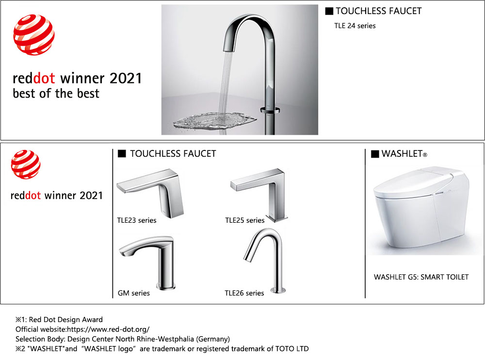 TOTO LTD. (Headquarters: Kita-Kyushu-shi, Fukuoka Prefecture; President: Noriaki Kiyota) has received design awards for six of its products as part of the Red Dot Design Award 2021, a prestigious international design award scheme. Among the winning products, the TOUCHLESS FAUCET TLE24 series for Overseas was selected for the "Best of the Best" award, the highest award generally given to less than 2% of entries in a given year.The Red Dot Design Award is a prestigious international award that has continued since 1955. Organized by the Design Center North Rhine-Westphalia in Essen, Germany, the awards are granted to products after a rigorous review process conducted by design professionals, taking into account various criteria including innovativeness, functionality and quality. Among the three categories of Product Design, Brands & Communication and Design Concept, TOTO received awards for six products in the Product Design category.This marks the ninth consecutive year that TOTO has received a Red Dot Design Award. It is also the second time TOTO has been awarded "Best of the Best," after receiving the honor for the first time in 2017. TOTO will continue to pursue the fusion of design and technology to deliver a better life to customers. Features of the Award-Winning Products Common Features of the TOUCHLESS FAUCET CTOUCHLESS FAUCET are a hygienic product that can be used with peace of mind by allowing people to wash their hands without coming into contact with surfaces in restroom spaces, thanks to their touchless features. TOTO has improved the design quality of the faucet itself by installing compact sensor by the spout to realize high-performance and comfortable usability. A feature of TOTO faucets is their ability help save water resources, such as by preventing faucets from being left to run. Common Design Concept (except GM series) Based on geometric shapes such as circles, ellipses and squares, we pursue forms that are simple yet luxurious with subtle angles and curved surfaces. · TOUCHLESS FAUCET TLE24 series The design is based around smooth curved surfaces with particular attention given to the smooth oval shape of the faucet opening. [Sales areas: US, China, Thailand, Vietnam, India, etc.]* Product range varies by region where TOTO products are sold. * The product is planned for a staggered release starting June 2021. · TOUCHLESS FAUCET TLE23 series The design seeks to combine straight edges with soft arcs. We also focused on the tip of the water outlet, achieving a thickness of just 11 mm. Sales areas: US, China and elsewhere]* Product range varies by region where TOTO products are sold. * The product is planned for a staggered release starting June 2021. · TOUCHLESS FAUCET TLE25 series This type seeks to give an elegant appearance by applying a delicate curved edge to a square spout. Sales areas: Japan, US, China, Thailand, Vietnam, India, and elsewhere]* Product range varies by region where TOTO products are sold. * Scheduled for staggered release starting April 2021. · TOUCHLESS FAUCET TLE26 series With a design that matches any washbasin, it incorporates an extremely simple structure with the use of curved tube materials. Sales areas: Japan, US, China, Thailand, Vietnam, India, and elsewhere]* Product range varies by region where TOTO products are sold. * Scheduled for staggered release starting April 2021. · TOUCHLESS FAUCET GM Series The concept of this series is to take on the aesthetic sense of traditional Japanese culture and transform it into a form with modern, refined beauty and powerful originality. In a homage to the torii gate, one of Japan's traditional architectural features, a flexible bow-shaped spout has been designed. [Sales areas: US, China, Thailand, Vietnam, India, etc.]* The product is planned for a staggered release starting June 2021.* Product range varies by region where TOTO products are sold. Features of WASHLET WASHLET was born in Japan in 1980 and is teaching the world a living culture of "washing, not wiping." 40 years since its launch, a total of 55 million had been sold as of February 2021. With the likes of “EWATER+” and TORNADO FLUSH, TOTO toilets appears clean a new everytime. · WASHLET G5: SMART TOILET WASHLET G5 is equipped with a host of features and matches all kinds of bathroom spaces with simple shape in which straight and curved lines coexist. TOTO has paid particular attention to the lid, meticulously designed with digital modeling to draw attention to linear highlights, combining gentle curves with sharpness. Along with advanced cleaning features, the shape eliminates unnecessary irregularities and gaps making it easy to clean.