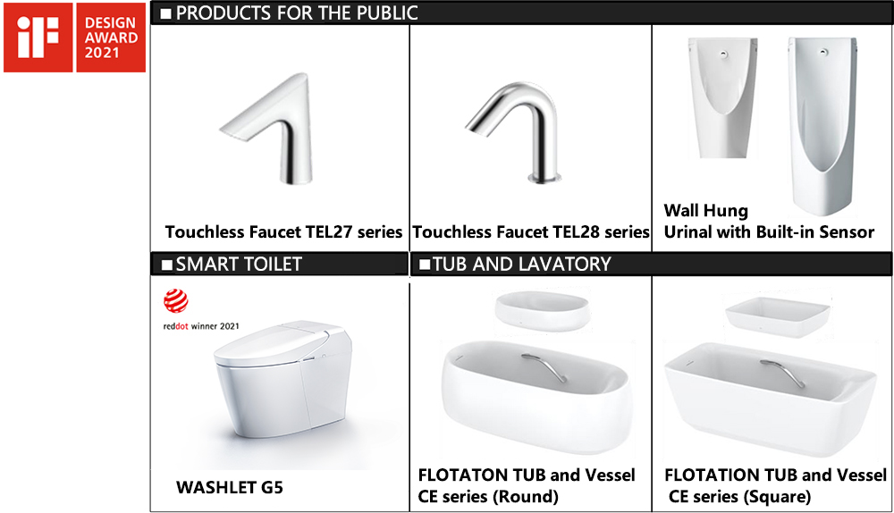 TOTO LTD. (Headquarters: Kitakyushu, Fukuoka Prefecture; President: Noriaki Kiyota) and its Touchless Faucet, WASHLET*1 G5, Wall Hung Urinal with Built-in Sensor, FLOTATION TUB and Lavatory CE Series, and two other products were awarded the internationally-renown iF Design Award*2 2021. WASHLET G5 was also awarded the Red Dot Design Award*3. Six TOTO products received high appraisals from among the 9,509 products from 52 countries entered as a result of the screening carried out by a panel of judges made up of well-known experts. This marks the eighth consecutive year that TOTO has received the Award. The iF Design Award has continued to be a prestigious design award since 1953, and is sponsored by iF (International Forum Design) based in Hanover, Germany. This award is presented to products after their beauty, functionality, and innovation have been rigorously examined and acknowledged by experts in design. TOTO will continue to pursue the fusion of design and technology to deliver a better life to customers. Award-winning Products Features of Products Offered to the Public TOTO has continued to offer proposals for new public restrooms through product and spatial proposals, aiming to create clean and pleasant public restroom spaces. Interest in touchless functions for public spaces has risen with a recent increase in hygiene awareness. Touchless faucets allow for touch-free hand washing and are a hygienic product that can be used safely. It also contributes towards the conservation of water resources, as the faucet is never accidentally left running. We were also able to realize a refined design by compactly fitting all EWATER+ functions into the spout tip, including the compact sensor, LED, and sanitized water spray device. · Touchless Faucet TEL27 series The simple design combines a square spout and cylindrical body. Beautiful highlights smoothly connect sharp edges with the top. Sales Area: Japan, China, Vietnam, Thailand, India, U.S.A., etc.*The product is planned for a staggered release starting in April *EWATER+ is installed on products for the Chinese and American markets only · Touchless Faucet TEL29 series The minimalistic design removes unnecessary elements, and uses the same diameter from base to spout. The faucet matches the many styles of public restrooms.Sales Area: Japan, China, Vietnam, Thailand, India, U.S.A., etc.*The product is planned for a staggered release starting June 2021. *EWATER+ is installed on products for the Chinese and American markets only · Wall Hung Urinal with Built-in Sensor We created a clean design, integrating the water spreader and sensor that detects when a person is present. Even when using multiple types with different sizes, the upper parts line up, allowing the urinals to be set up along a straight line and offering a clean look to the space. The inside of the bowl can be checked easily when in use, and the design makes users stand even closer to the urinal, reducing drips. The angled surface inside the bowl also reduces splashes and improves hygiene. Sales Area: Japan (low lip model only), China, Taiwan, Vietnam, Thailand, India, etc. *sales have already begun WASHLET Smart toilet Features WASHLET was created in Japan in 1980 and is teaching the world a living culture of "washing, not wiping." 40 years since its launch, a total of 55 million had been sold as of February 2021. With the likes of EWATER+ and TORNADO FLASH, TOTO toilets appears clean a new everytime. · WASHLET G5: Smart toilet WASHLET G5 is equipped with a host of features and matches all kinds of bathroom spaces with simple shape in which straight and curved lines coexist. TOTO has paid particular attention to the lid, meticulously designed with digital modeling to draw attention to linear highlights, combining gentle curves with sharpness. Along with advanced cleaning features, the shape eliminates unnecessary irregularities and gaps making it easy to clean. Sales Area: China, etc. *Staggered release starting January 2021 Tub and Lavatory Features GALALATO used in both tub and lavatory is an artificial marble that offers strength and a beautiful finish through TOTO's technology. Both a glossy and a matte finish are offered. Combining design concepts for both tub and lavatory creates a sense of unity in the space. The tub allows for both stability and a position of low physical stress, as we thoroughly sought after a scientifically-based bathing sensation, and the lavatory was designed for ease of use when hand-washing and for prevention of splashes. · FLOTATION TUB and Lavatory CE Series (Round) The round type was designed with an oval shape based on the concepts of softness and dignity.Sales Area: U.S.A., Europe, China, Taiwan, Vietnam, Thailand, India, etc. *sales have already begun · FLOTATION TUB and Lavatory CE Series (Square) The square type was designed with a rectangular shape based on the fusion of the concepts of tension and relaxation. Sales Area: U.S.A., Europe, China, Taiwan, Vietnam, Thailand, India, etc.*sales have already begun